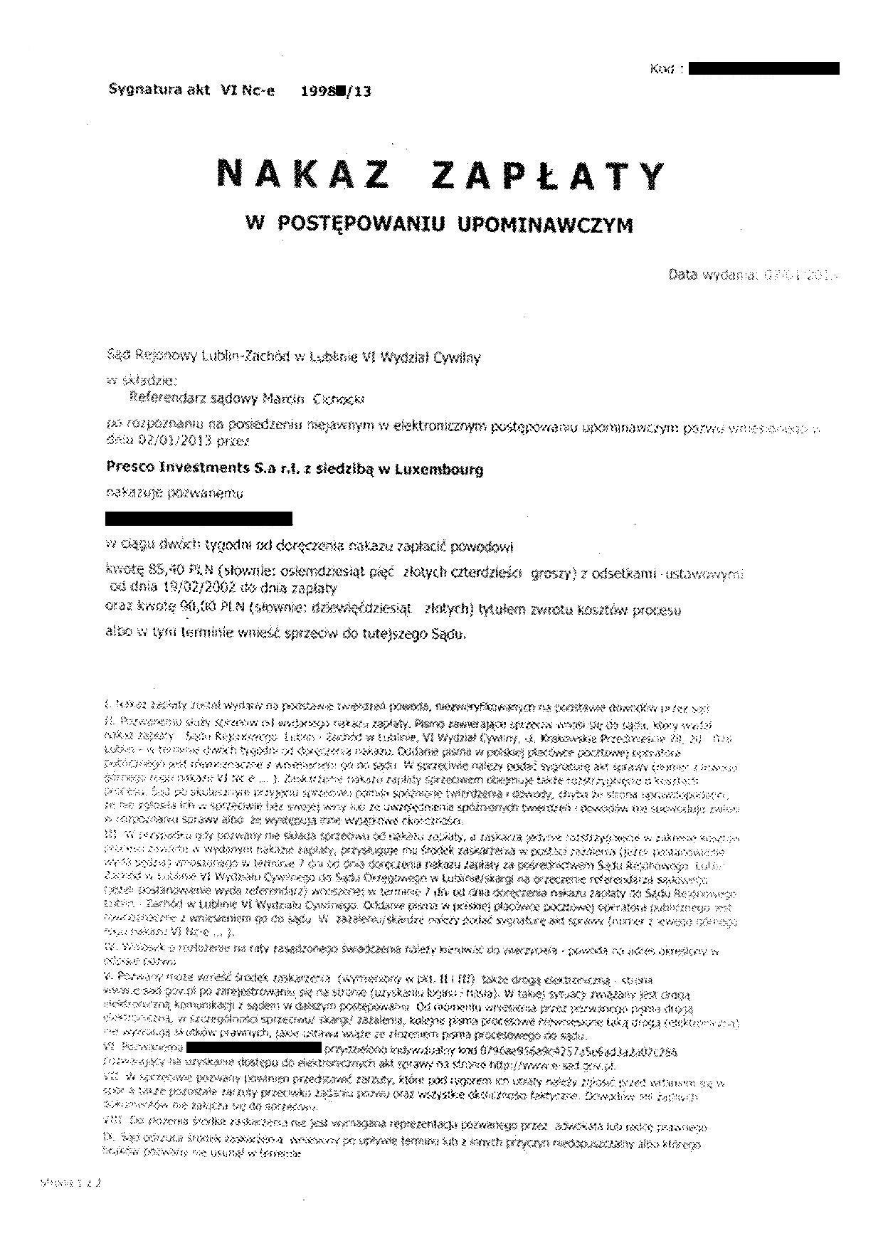 Czy w 2013 r. czeka Was więcej pozwów w e-sądzie a tym samym więcej nakazów zapłaty? Nie jest to wykluczone. Właśnie otrzymaliśmy nakaz zapłaty wydany w dniu 7 stycznia 2013 r. na rzecz znanej firmy z Luksemburga. Pozew został wniesiony 2 stycznia 2013 r. a więc w pierwszym dniu roku. Roszczenie oczywiście od lat przedawnione …